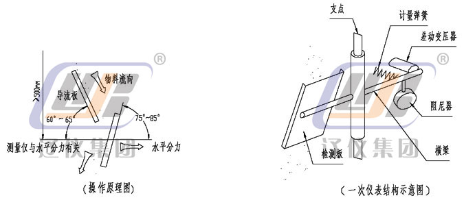 干燥的散裝固體物料自由落體沖擊到傳感檢測板(沖板)上后,傳感檢測板產(chǎn)生機械偏移。然后散裝物料流連續(xù)而無阻礙的通過。即:由于沖擊力與傳感檢測板具有一定角度,故該力分解成一個水平分力和一個垂直分力。垂直分力由變送器的機械結構克服而不起作用,而水平分力有一個差動傳感器(線性可調(diào)差動變送器),這個信號經(jīng)與之相連的積算儀檢測和處理,得出瞬時流量和累積流量。